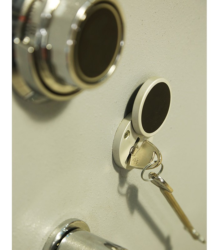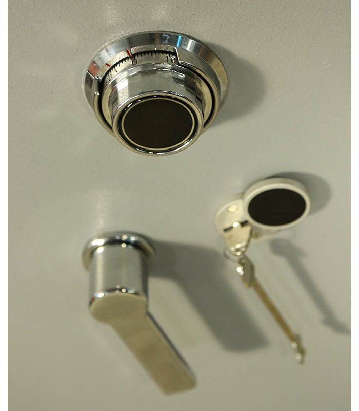 Une poignée ergonomique permet de commander aisément le maniement des pênes et le mouvement de la porte. Le mouvement de cette poignée est condamné par une serrure à clé de haute sécurité à double pannetons (certifiée VDS classe A) et d’une serrure à combinaison 3 disques (1 million de combinaisons). En outre, un délateur se déclenche immédiatement en cas d’attaque thermique et re-bloque la serrure.