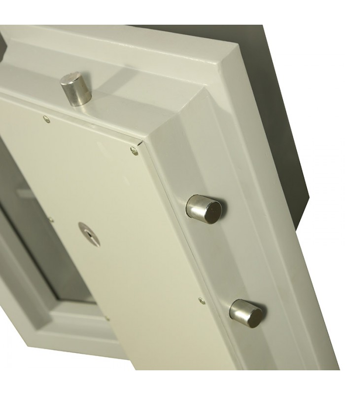 Porte : épaisseur totale de 135mm. Elle comporte la même protection que le corps. Elle est suspendue sur des pivots extérieurs permettant l’ouverture de celle-ci à 180°. Son châssis est composé de profils spéciaux formant escalier sur les 4 côtés.