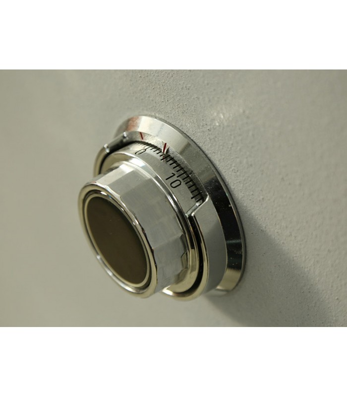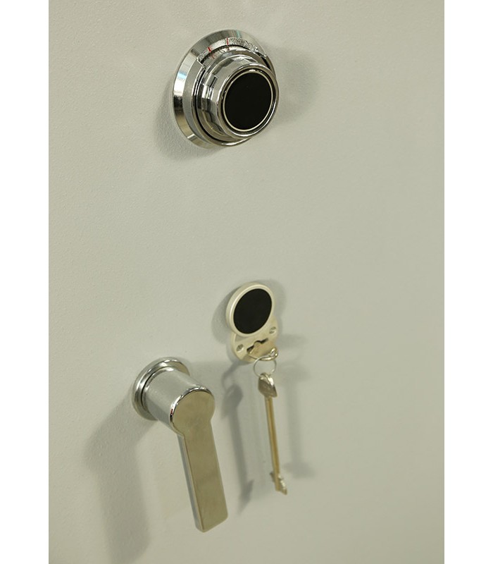 Une poignée ergonomique permet de commander aisément le maniement des pênes et le mouvement de la porte. Le mouvement de cette poignée est condamné par une serrure à clé de haute sécurité à double pannetons (certifiée VDS classe A) et d’une serrure à combinaison 3 disques (1 million de combinaisons). En outre, un délateur se déclenche immédiatement en cas d’attaque thermique et re-bloque la serrure.