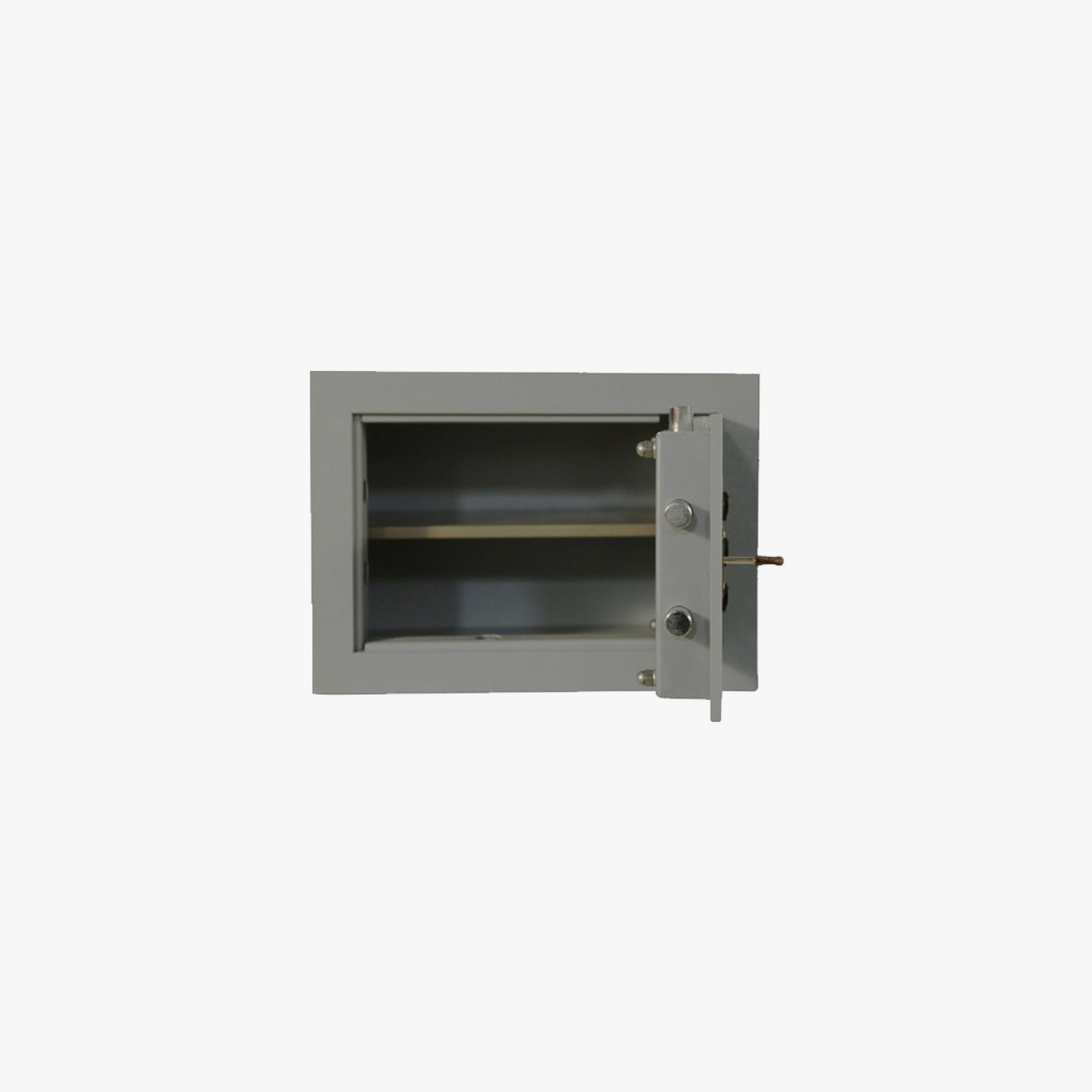 Coffre fort CLYPEUM+ 1 – Corps en forte tôle d’acier à noyer et sceller dans la maçonnerie. Porte en tôle d’acier de 8mm d’épaisseur montée sur pivots intérieurs avec dispositif d’accrochage du côté des pivots.